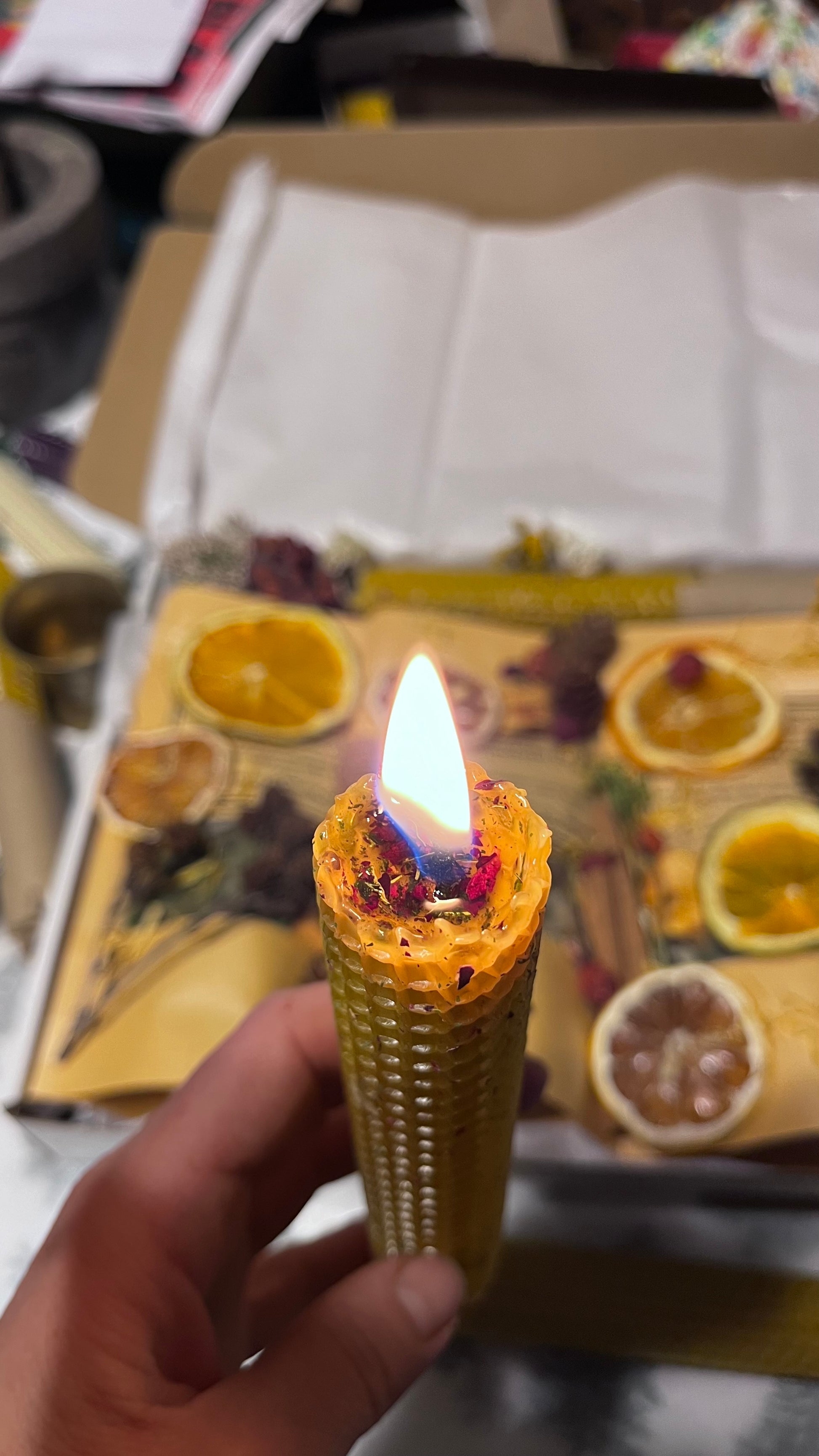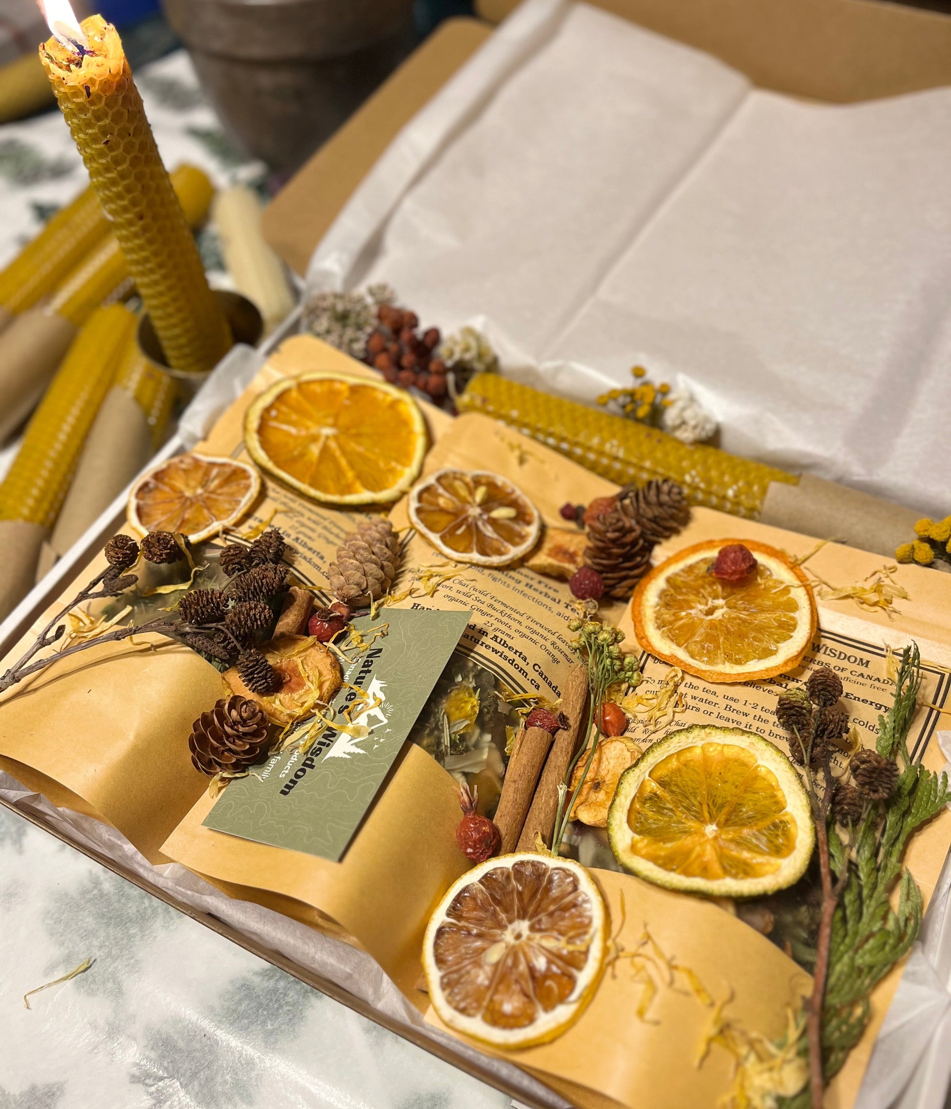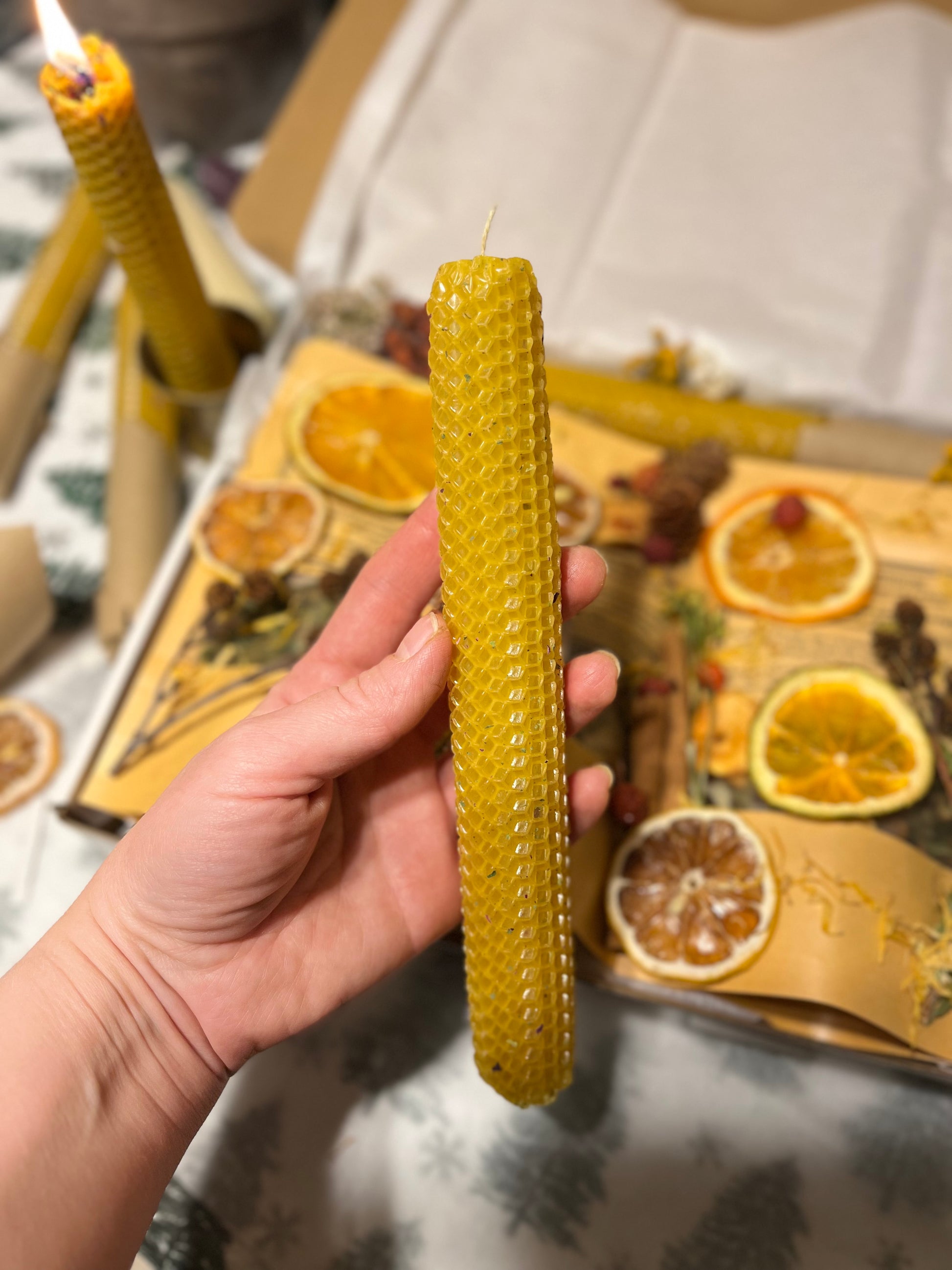 • A handcrafted beeswax candle with herbs — glowing softly, filling the room with gentle light and natural seasonal charm.